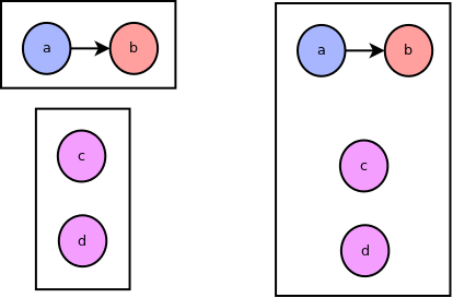 With the grammar in place, it's time to make it actually do stuff. We need to put in semantic actions, or transforms as Proto calls it, next to each grammar rule. In TBB, each node is both a sender and receiver of messages (and is derived from sender<T> and receiver<T>). As we combine the nodes together using the two operators, we produce a compound node which has some of the nodes inside of it acting as its senders and some as receivers. For example, suppose we have an expression (a > b) > (c > d > e) and we have independently build up two compound nodes, (a > b) and (c > d > e). We now join the two using the > operator. The > operator splices together the left-hand's senders with right-hand's receivers. In the diagrams below, the box represents the compound node, the receivers are colored blue, the senders are colored red and nodes acting as both receivers and senders are colored purple. For the example above, the following diagram illustrates the before and after the splice. Note that while 'a' is sending messages to 'b', it is actually the receiver of the compound node.The + operator joins the two compound nodes by combining the left-hand's receivers with right-hand's receivers and left-hand's senders with right-hand's senders. Again, suppose for the expression (a > b) + (c + d) we are joining (a > b) with (c + d). The following diagram shows the before and after: